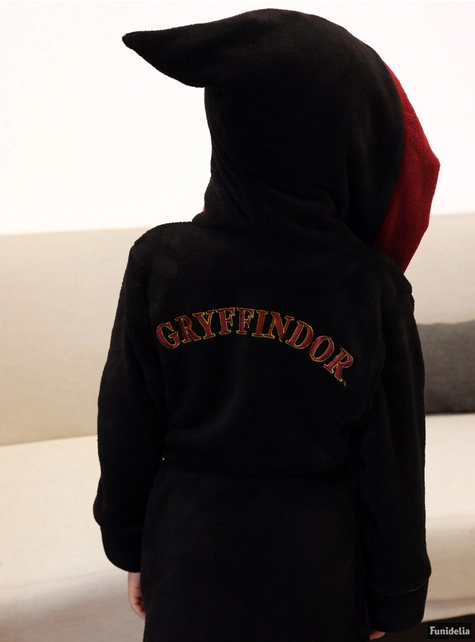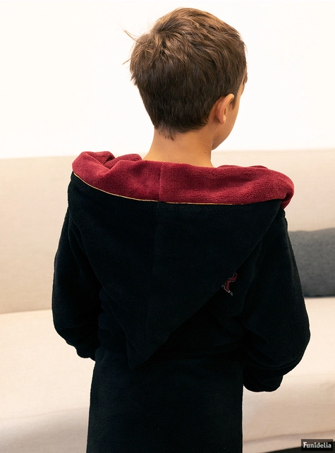 De aspecto similar al de la túnica de Gryffindor, esta bata infantil para estar por casa tiene capucha y es un albornoz polar de color negro y el granate de Gryffindor. Y, además, incorpora el escudo del león de Gryffindor y el nombre de la casa en la espalda.
