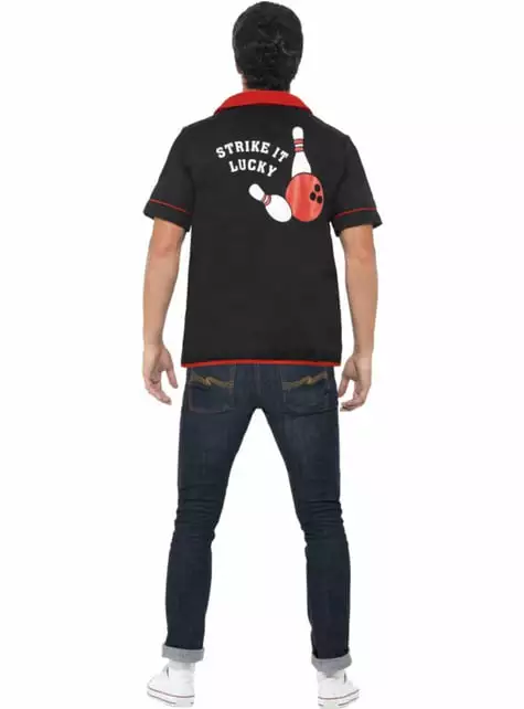 Este divertido disfraz de jugador de bolos incluye una camisa negra con detalles rojos.