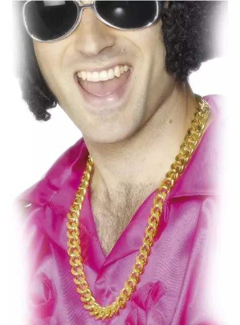 Incluye un ostentoso collar dorado de eslabones grandes.