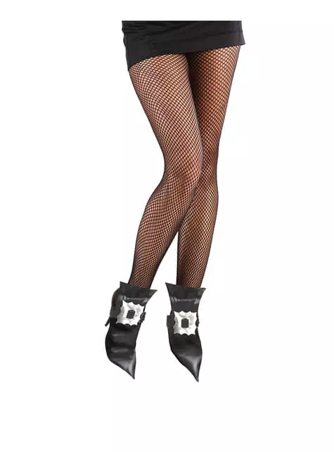 Incluye unos cubrebotas de bruja, que simulan unos zapatos negros de punta con hebillas.