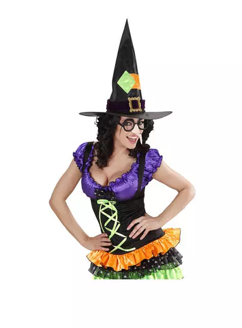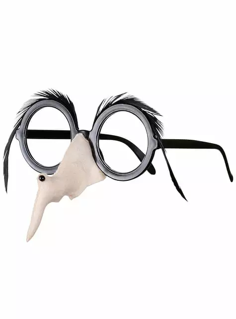 Incluye unas gafas redondas y negras de plástico con una nariz aguileña de bruja, con verruga incorporada, y con unas largas cejas también negras.