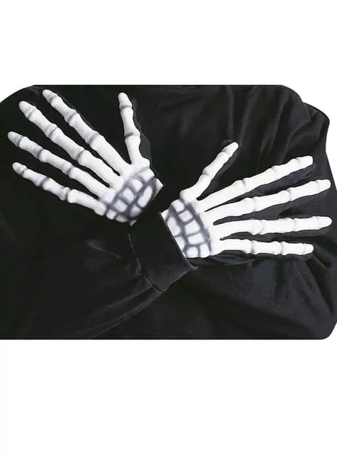 Incluye unos guantes negros con unas manos blancas de esqueleto fluorescentes con efecto 3D.