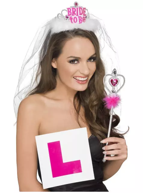 Incluye: tiara, velo, placa de L y varita