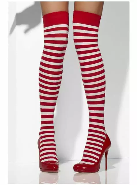 Completa tu disfraz y dale un toque sexy con estas medias de rayas blancas y rojas.