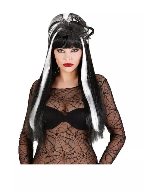 Incluye un mini sombrero negro con tela de malla con topos y encaje y una araña con ojos de piedra rojos. Tiene dos clips de pelo para sujetarlo de forma más cómoda a la cabeza.