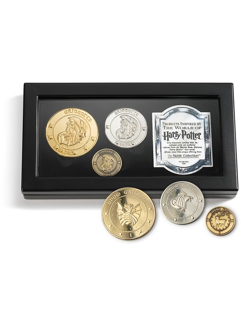 Incluye: Juego de monedas del banco Gringotts y colocado en una funda de monedas de colección. Cada moneda está bañada en oro, plata o cobre de 24 quilates.