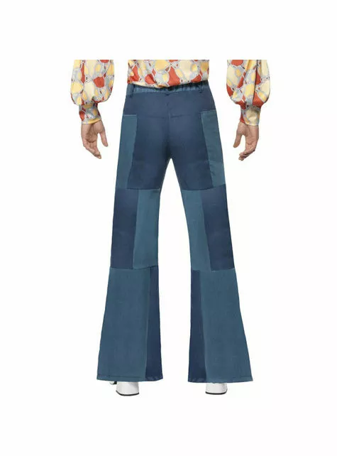 Incluye unos pantalones de campana azules de los años 70 para hombre.
