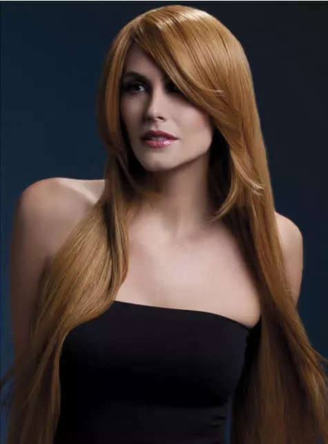 Incluye una peluca extra larga lisa, 71 cm. con flequillo largo de color caoba.