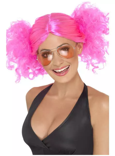 Incluye una peluca rosa de los años 80 con dos coletas una a cada lado.