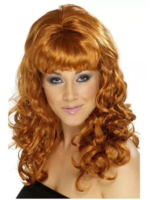 Incluye una peluca estilo beehive de color castaña rojiza y con rizos.