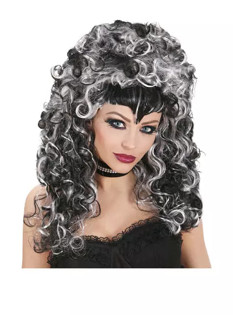 Incluye una peluca diabólica de reina oscura, de largo pelo rizado en color negro y blanco, con un flequillo peculiar terminado en un pico más largo por el centro.
