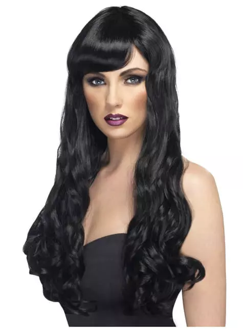 Incluye una peluca larga, rizada y con flequillo de color negro.