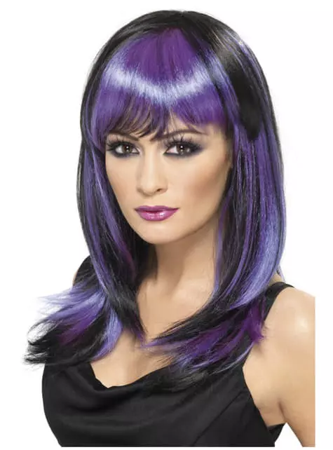 Incluye una peluca larga con flequillo negra y morada.