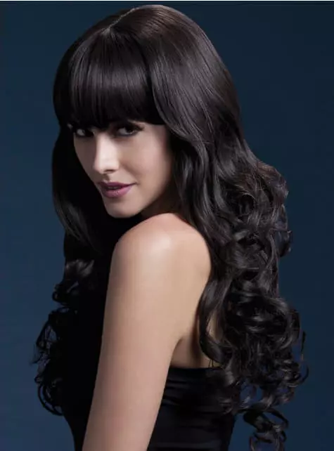 Incluye una peluca larga ondulada, 66 cm. con flequillo recto de color castaño.