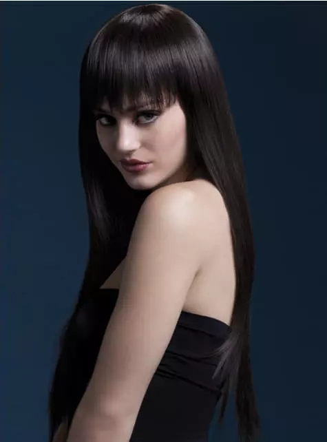 Incluye una peluca larga lisa, 66 cm. con flequillo recto de color castaño.