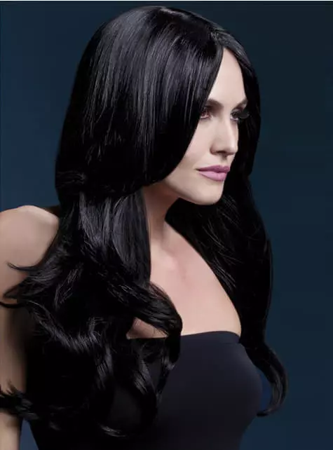 Incluye una peluca larga con ondas sueltas, 66 cm. con flequillo largo de color negro.