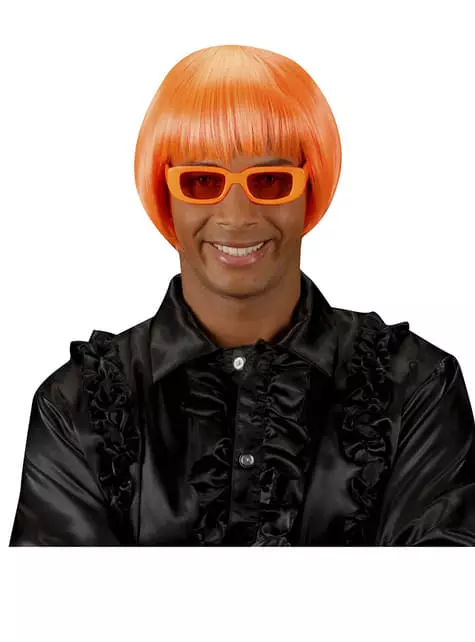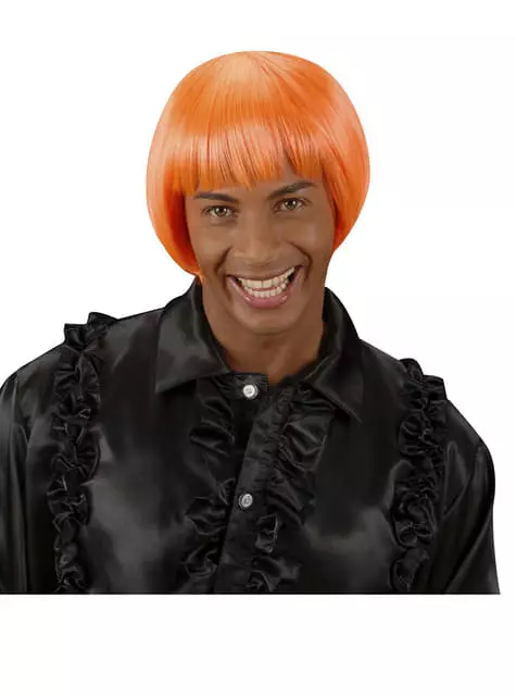 Incluye una psicodélica peluca de color naranja fluorescente, de pelo corto, liso y con flequillo.