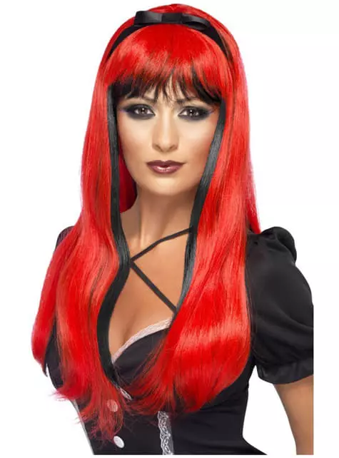 Incluye una peluca larga y lisa con flequillo de color rojo sobre negro.