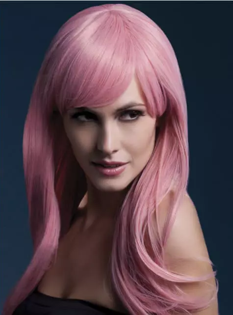 Incluye una peluca larga con capas, 66 cm. con flequillo recto de color rosa.