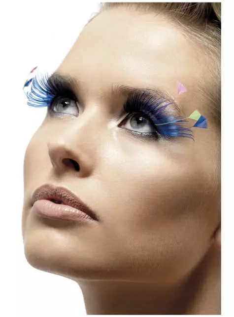 Incluye unas pestañas azules con plumas y contiene pegamento.