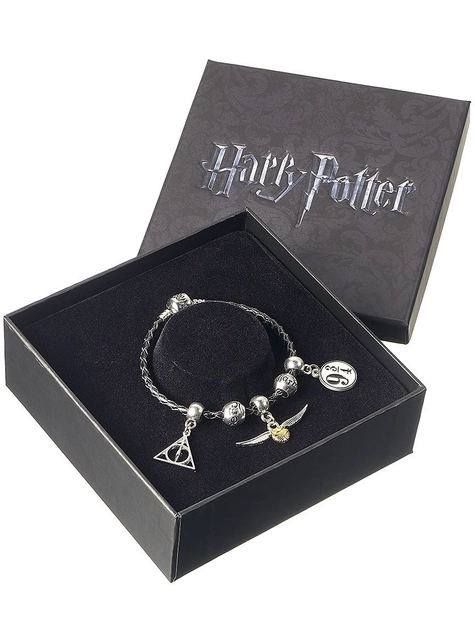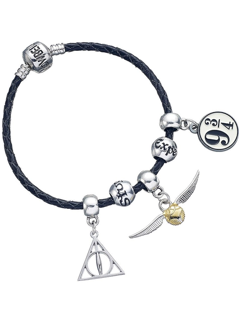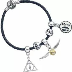 Incluye: Pulsera de cuero negro con charms oficiales de Harry Potter chapados en plata. La pulsera viene en una caja oficial de Harry Potter con el logo de Warner Bros. en el reverso
