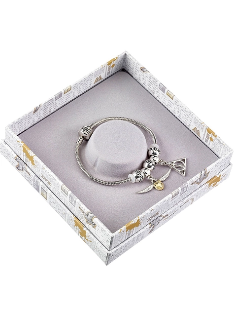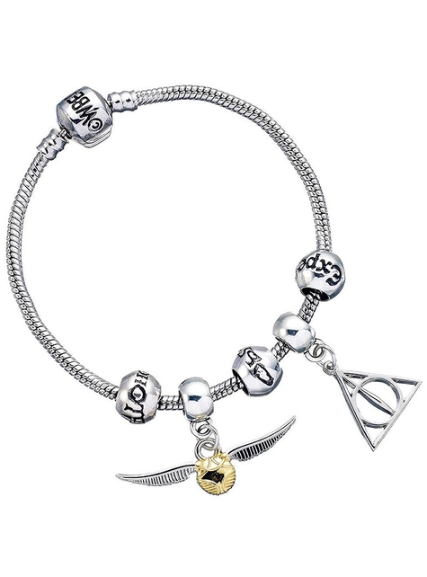 Incluye: Pulsera chapada en plata de 19 cm con abalorios: reliquias de la muerta, amuleto de Snitch con hechizos