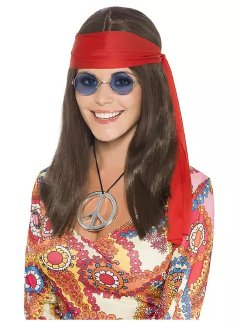 Incluye una peluca marrón con una banda para el pelo roja, un medallón con el símbolo de la paz y unas gafas de cristales azules.