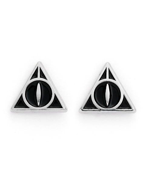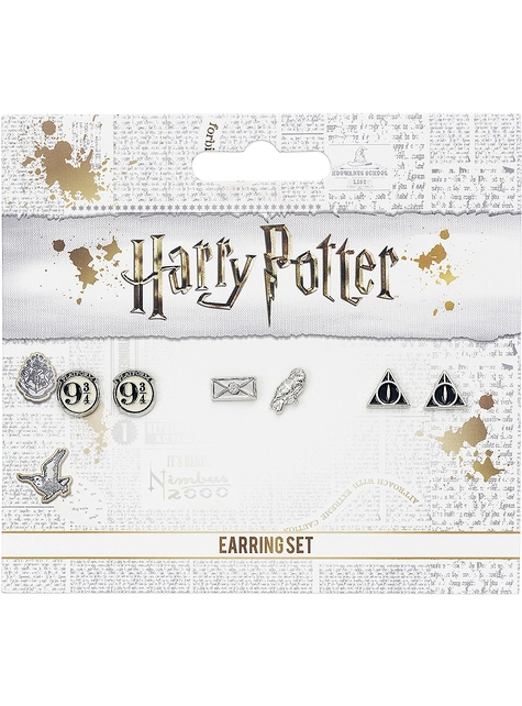 Incluye: 3 pendientes bañados en plata de la carta de aceptación del colegio Hogwarts, el andén 9 3/4 y el símbolo de las reliquias de la muerte