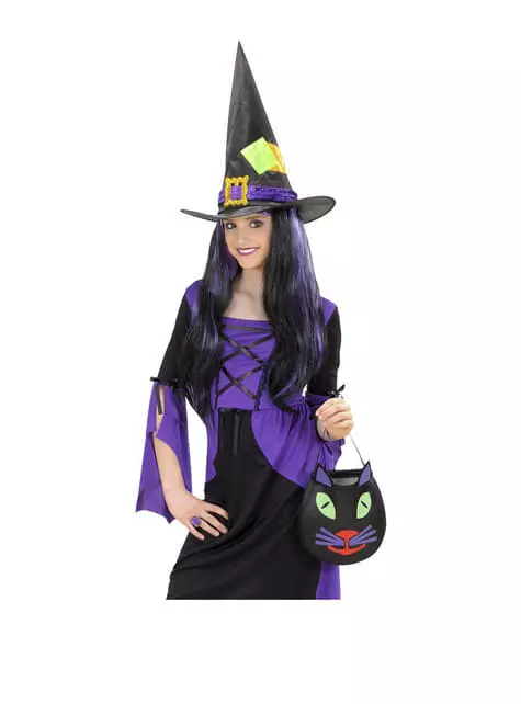 Incluye un sombrero de bruja de color negro, picudo, de raso, con dos parches de colores, uno verde y otro naranja y con un cinturón de terciopelo morado decorativo con hebilla.
